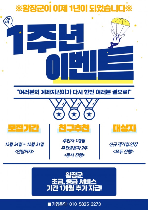 황장군 1주년 기념이벤트를 진행합니다.