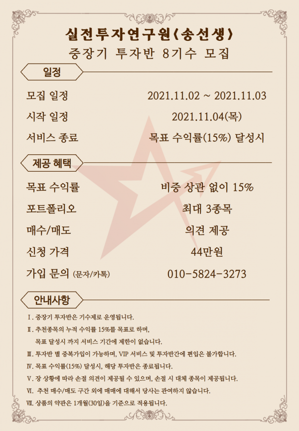 2021.11.02(화) 송선생 <중장기 투자반 7기> 목표수익률 15%달성으로 서비스를 종료하였습니다.