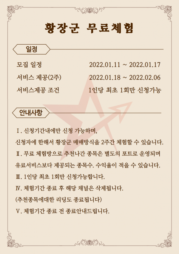황장군 <무료2주체험> 운영에 대해 안내드립니다!
