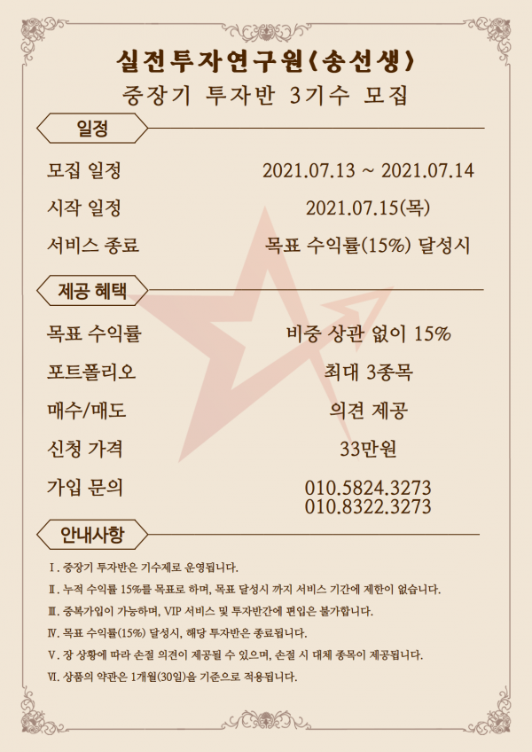 2021.07.13(화) 송선생 <중장기 투자반 2기> 목표수익률 15%달성으로 서비스를 종료하였습니다.